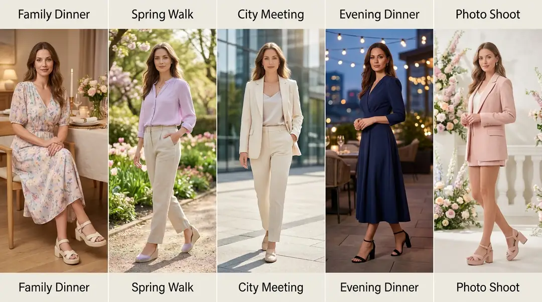 | Aile yemeği | Çiçekli ya da pastel midi elbise | Pastel, çiçekli, krem | Platform sandalet ya da loafer |