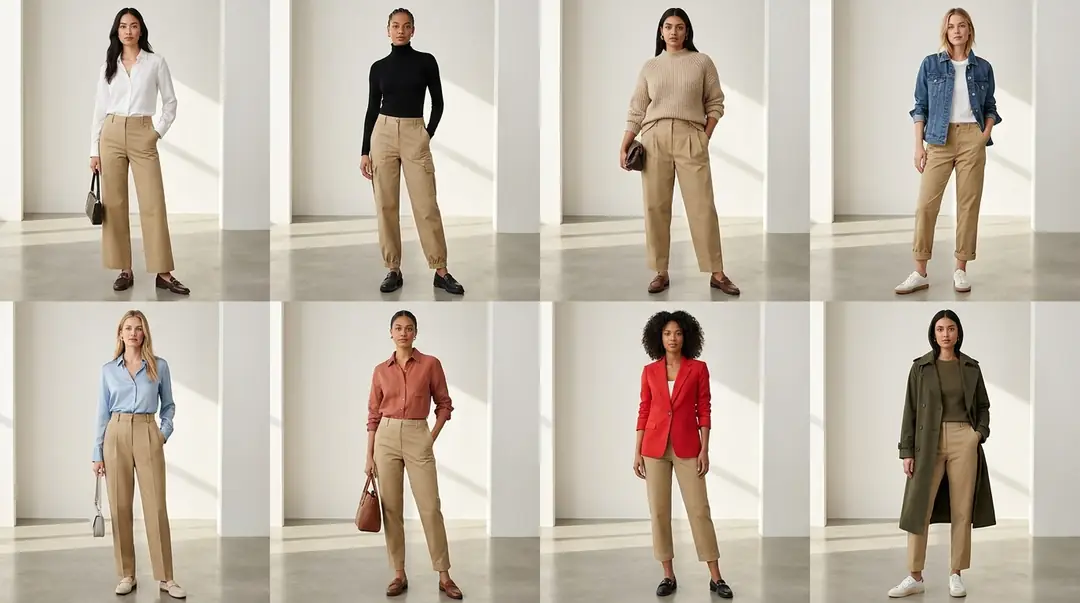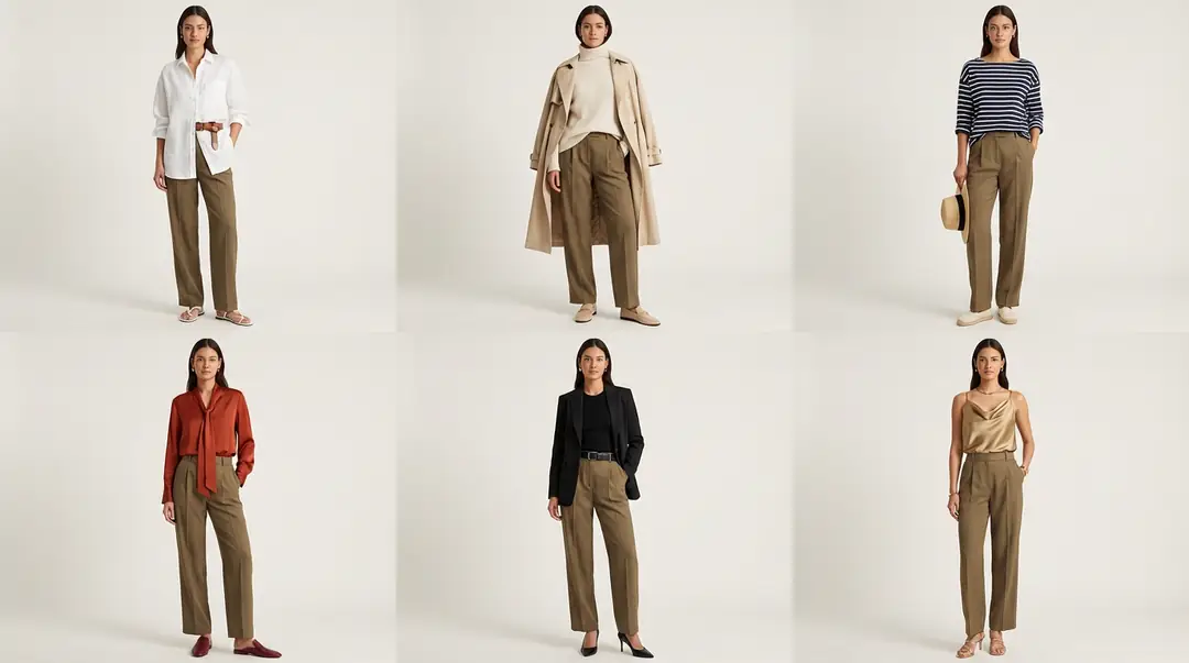 3. Tek karakter parçası: Haki pantolon zaten güçlü bir parça — üstüne çok kalabalık bir kombin eklemek gerekmiyor. Bir karakter parçası seç: çizgili gömlek, saten bluz, bordo kazak ya da güçlü bir aksesuar. Gerisini sade tut — haki pantolonu öne çıkar, onu gölgeleme.