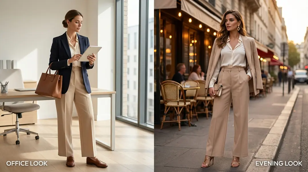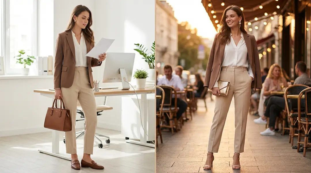 Akşam geçişi: Blazer çıkarılır ya da omuzlara atılır — bluz öne çıkar. Loafer yerine ince topuklu sandalet giyilir. Küçük omuz çantası yerine clutch çıkarılır. Küçük saplı küpe yerine zarif sarkıt küpe takılır. Toplam geçiş süresi: 3 dakika.