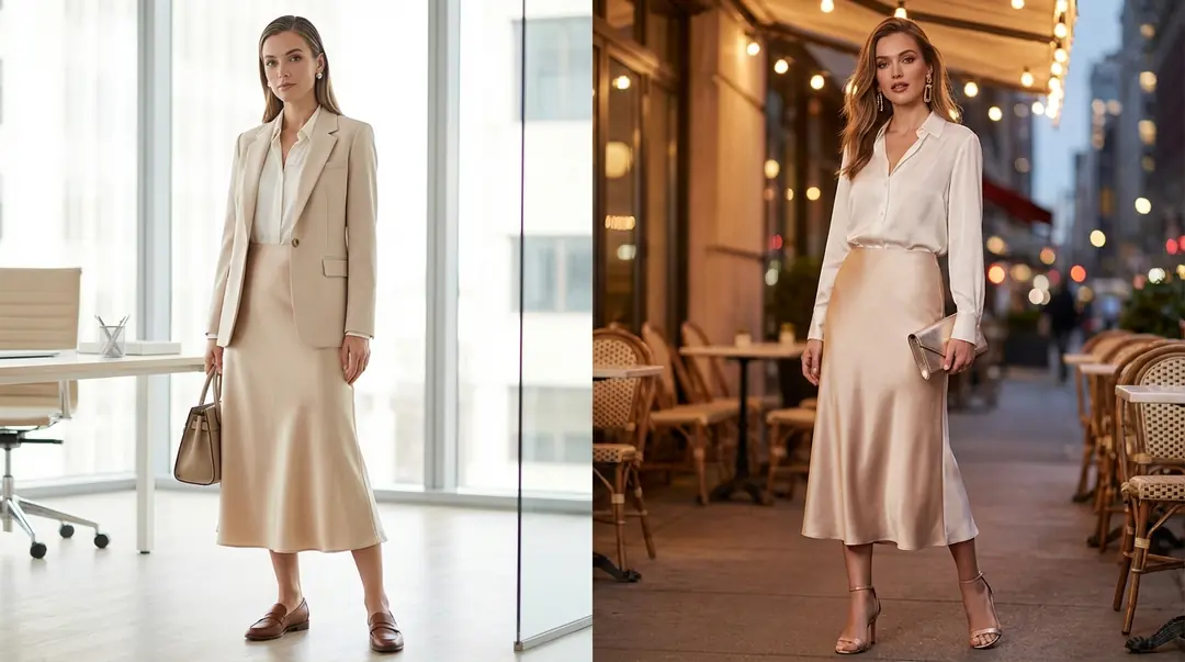 Akşam geçişi: Hırka ya da blazer çıkar. Loafer yerine ince topuklu sandalet. Büyük küpe ve parlak clutch çıkarılır. Saten kumaş akşam ışığında zaten yeterince gösterişlidir — tek bir büyük aksesuar kombinasyonu tamamlamak için yeterli.